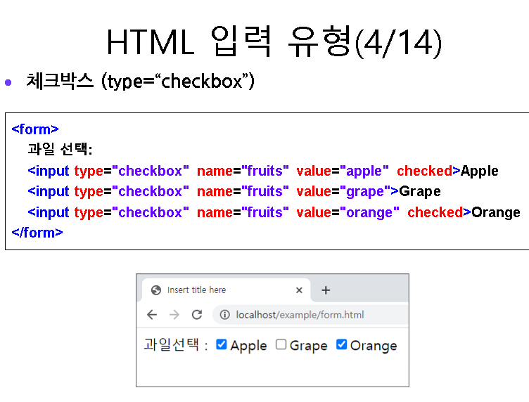 <input type = "checkbox" name="food" value = "김밥">김밥